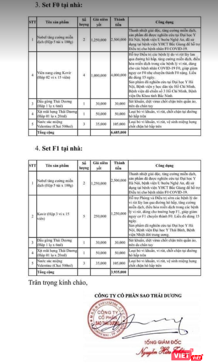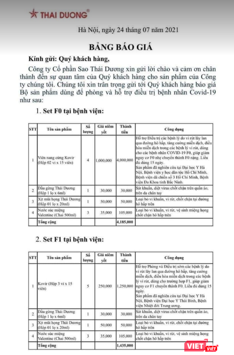 Đáng chú ý, bên cạnh đó, Công ty Cổ phần Sao Thái Dương còn thông báo báo giá 2 bộ sản phẩm dùng để phòng và hỗ trợ điều trị cho bệnh nhân mắc COVID-19.