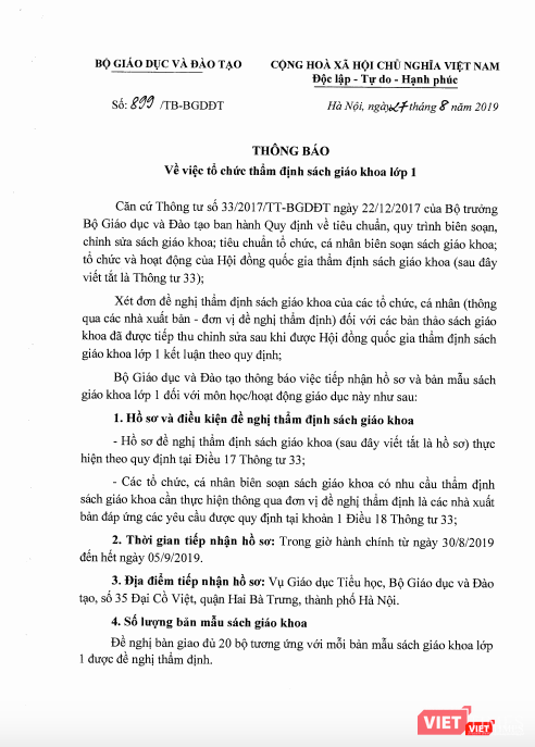 Thông báo về việc tổ chức thẩm định sách giáo khoa lớp 1