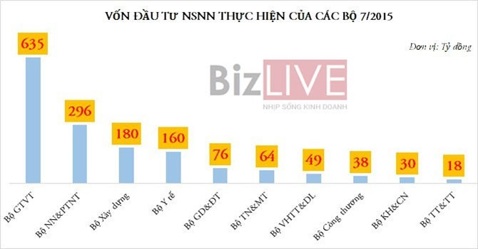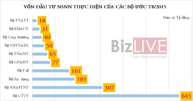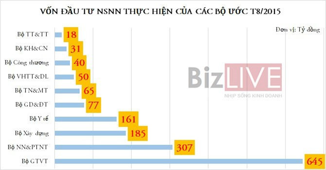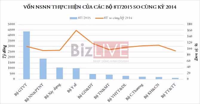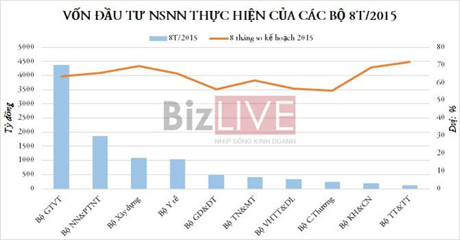 BizLIVE cập nhật số liệu vốn đầu tư thực hiện của 10 bộ, ngành trong 8 tháng đầu năm 2015: