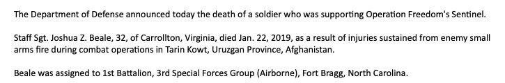 Thượng sĩ lực lượng đặc nhiệm Joshua Z. Beale, 32 tuổi, đến từ Carrollton, Virginia thiệt mạng do bị trúng thương nặng trong một cuộc giao chiến với lực lượng nổi dậy Taliban ở khu vực Tarin Kowt, tỉnh Uruzgan, Afghanistan.