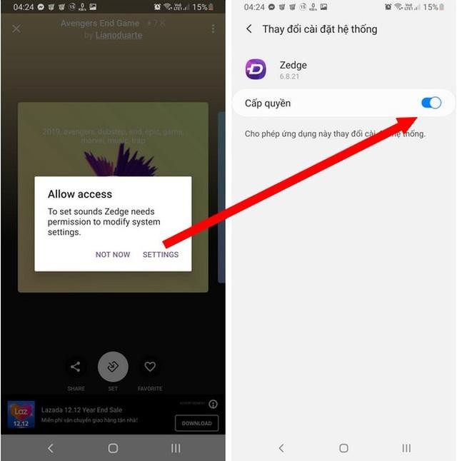 Ứng dụng sẽ xin cấp quyền để được phép thay đổi nhạc chuông trên smartphone. Bạn nhấn nút "Settings" từ hộp thoại, sau đó chọn "Cấp quyền" tại giao diện hiện ra sau đó.