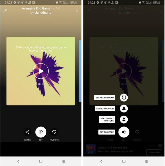 Ngoài việc chọn "Set ringtone" để thay đổi nhạc chuông, bạn có thể chọn "Set contact ringtone" để thiết lập nhạc chuông cho từng người cụ thể có trong danh bạ hoặc chọn "Set notification" để thiết lập âm thanh cho thông báo đến. Bạn cũng có thể chọn "Set alarm sound" để chọn bản nhạc của ZEDGE để làm âm thanh báo thức.