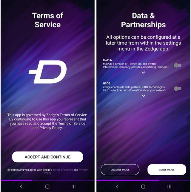 Tại giao diện hiện ra trong lần sử dụng đầu tiên, bạn nhấn nút "Accept and Continue" để đồng ý với các điều khoản sử dụng của ứng dụng, rồi chọn tiếp "Disagree to All" tại giao diện hiện ra tiếp theo.