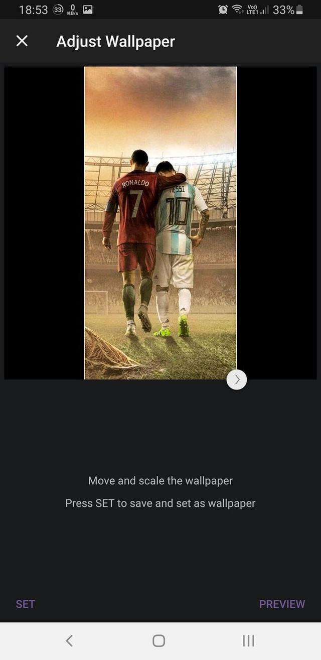 Ứng dụng sẽ cho phép người dùng di chuyển, căn chỉnh lại hình ảnh cho phù hợp với màn hình smartphone. Bạn có thể nhấn nút "Preview" để xem trước hoặc nhấn nút "Set" để lưu lại và xác nhận thay đổi hình nền.