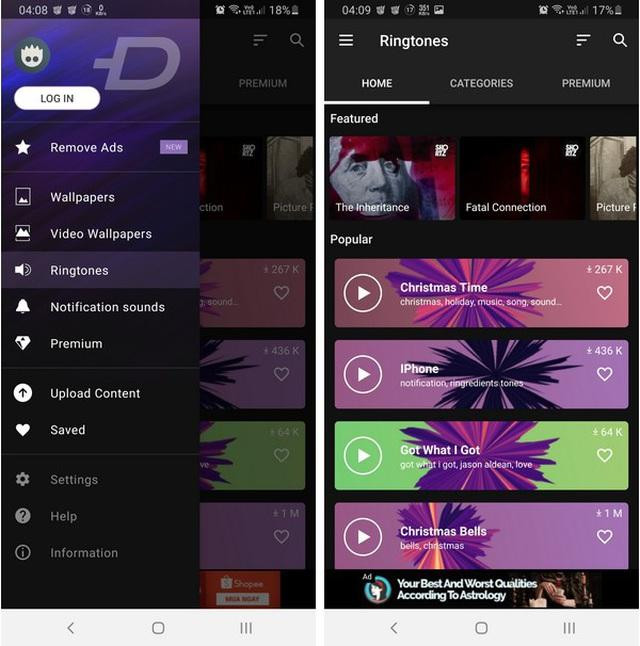 Để lựa chọn và sử dụng nhạc chuông do ZEDGE cung cấp, từ giao diện chính của ứng dụng, bạn nhấn vào nút menu ở góc trên bên trái, chọn "Ringtones" từ danh sách hiện ra. Giao diện của ZEDGE sẽ hiển thị các bản nhạc chuông được nhiều người yêu thích và sử dụng nhiều nhất hiện nay.