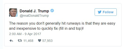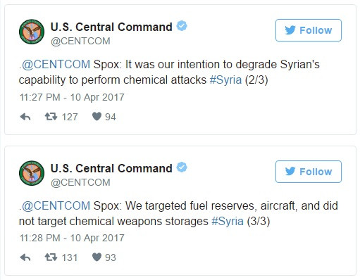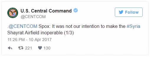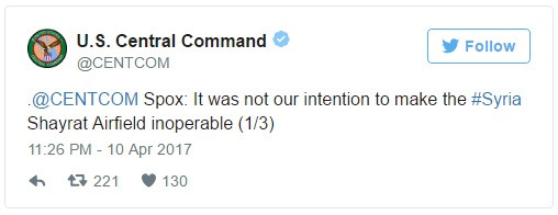 Nhưng một vấn đề gây tranh cãi trên mạng xã hội là quân đội Syria đã nhanh chóng đưa sân bay quân sự Shayrat trở lại hoạt động chỉ trong vài giờ sau khi cuộc tấn công của không quân Mỹ. Những chiến tích này khiến cho trên các phương tiện truyền thông xã hội dấy lên một làn sóng tranh cãi đáng lo ngại. Kết quả là các phương tiện truyền thông chính thống, dẫn nguồn từ những “quan chức quốc phòng dấu tên” và thậm chí cả tổng thống Trum đã cố gắng giải thích "thành công" từ ngày 08.04.2017. Bây giờ, CENTCOM cũng buộc phải tham gia.