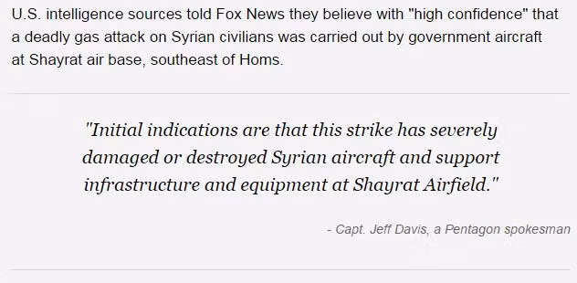 Theo Fox News, dẫn nguồn tin từ tình báo Mỹ cho biết: tình báo Mỹ chắc chắn rằng cuộc tấn công bằng khí độc sát thương dân thường ở Syria là do chiến đấu cơ của chính quyền Syria thực hiện, xuất kích từ căn cứ không quân Shayat, phía đông nam tỉnh Homs.