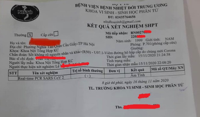 Bệnh nhân và người nhà được cách ly và điều trị tại Bệnh viện Bệnh nhiệt đới Trung ương. Kết quả xét nghiệm bằng phương pháp Realtime-PCR tại đây lại cho thấy, bệnh nhân âm tính với virus SARS-CoV-2.