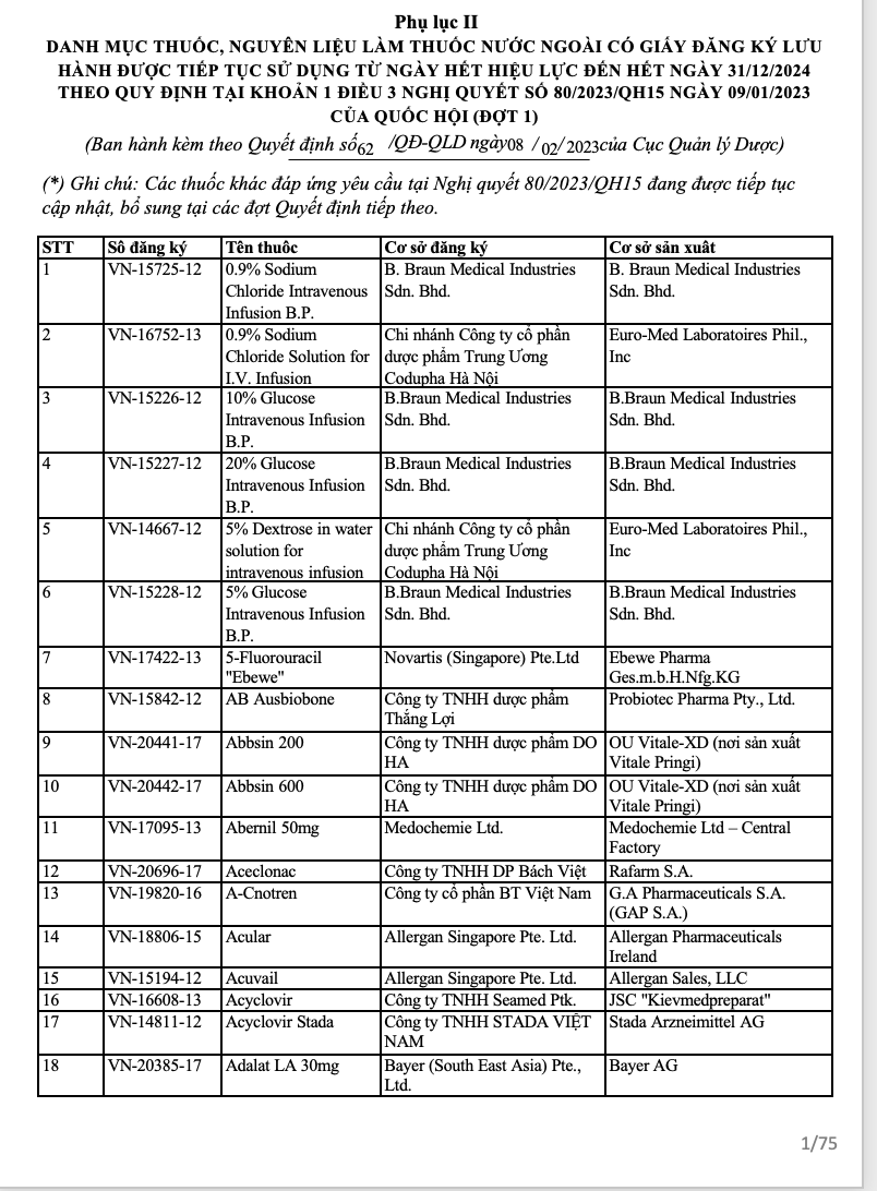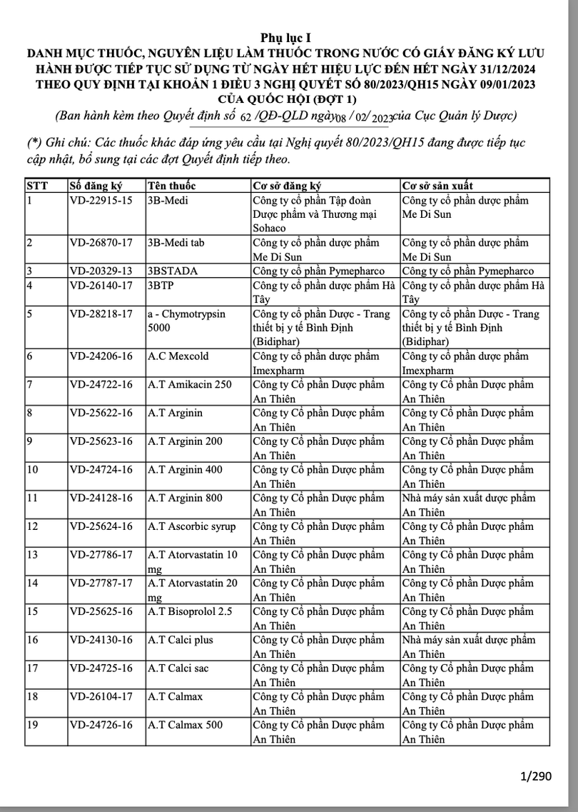 Quyết định 62/QĐ - QLD do ông Vũ Tuấn Cường - Cục trưởng Cục Quản lý Dược (Bộ Y tế) - ký, có hiệu lực ngay ngày 8/2/2023. Kèm theo Quyết định 62 là Danh mục 8.800 loại thuốc, nguyên liệu làm thuốc có giấy đăng ký lưu hành được tiếp tục sử dụng từ ngày hết hiệu lực đến hết ngày 31/12/2024 theo quy định tại khoản 1 Điều 3 Nghị quyết số 80/2023/QH15 ngày 09/01/2023 của Quốc hội (đợt 1).