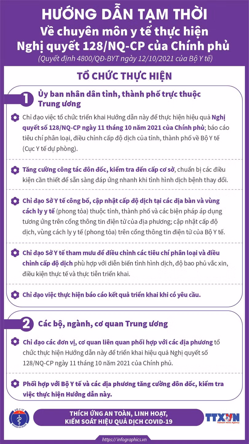 Thực hiện Nghị quyết 128/NQ-CP của Chính phủ, Bộ Y tế đã ban hành Quyết định hướng dẫn tạm thời các biện pháp chuyên môn y tế thực hiện Nghị quyết của Chính phủ ban hành Quy định tạm thời "thích ứng an toàn, linh hoạt, kiểm soát hiệu quả dịch COVID-19".