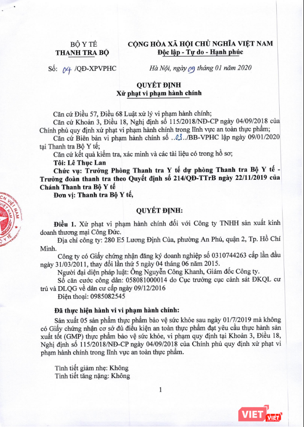 Theo Thanh tra Bộ Y tế, Công ty TNHH Sản Xuất Kinh Doanh Thương Mại Công Đức (địa chỉ: 280 E5 Lương Định Của, phường An Phú, quận 2, TP. Hồ Chí Minh) đã sản xuất 5 sản phẩm thực phẩm bảo vệ sức khỏe sau ngày 1/7/2019 không có Giấy chứng nhận cơ sở đủ điều kiện an toàn thực phẩm đạt yêu cầu thực hành sản xuất tốt (GMP) thực phẩm bảo vệ sức khỏe, vi phạm Nghị định quy định về xử phạt vi phạm hành chính trong lĩnh vực an toàn thực phẩm của Chính phủ.
