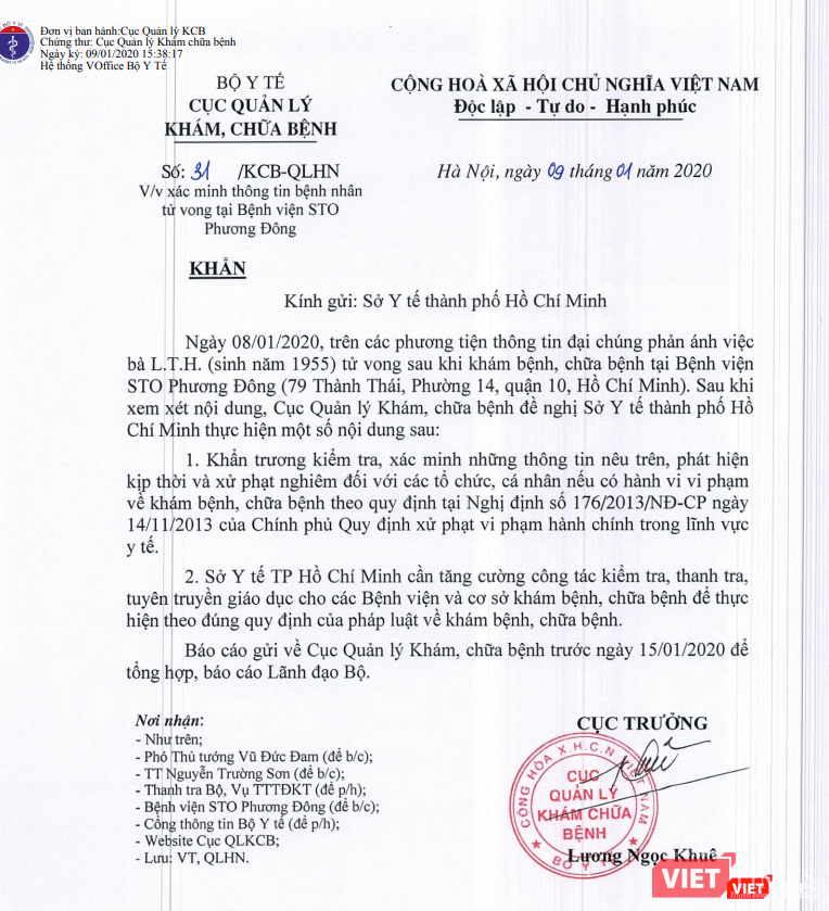 Theo Cục Quản lý Khám, chữa bệnh, ngày 8/1, báo chí đã phản ánh thông tin về bà L.T.H. (sinh năm 1955) tử vong sau khi khám, chữa bệnh (điều trị chấn thương gãy xương bánh chè khớp gối) tại Bệnh viện STO Phương Đông (địa chỉ: 79 Thành Thái, phường 14, quận 10, TP. Hồ Chí Minh).