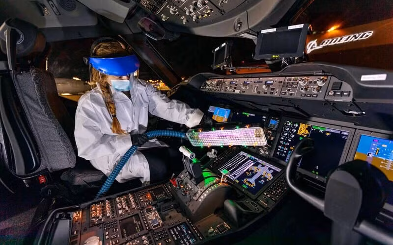 Thứ hai, Boeing phát triển đèn cực tím, giúp khử khuẩn khoang máy bay và buồng lái mà không cần đến các dung dịch khử khuẩn thông thường. Buồng lái có nhiều thiết bị điện tử và nhạy cảm với chất lỏng, do đó, sử dụng đèn cực tím giúp bảo vệ các thiết bị này. Đèn cực tím cũng sẽ có ích cho các hãng hàng không có tần suất khai thác lớn và phải liên tục vận hành máy bay. Gần đây, Boeing đã ký thỏa thuận hợp tác đối tác để sản xuất thiết bị này. Trong chương trình ecoDemonstrator, hãng cũng thử nghiệm lớp phủ kháng khuẩn có thể sử dụng tại các khu vực thường xuyên tiếp xúc trong khoang máy bay.
