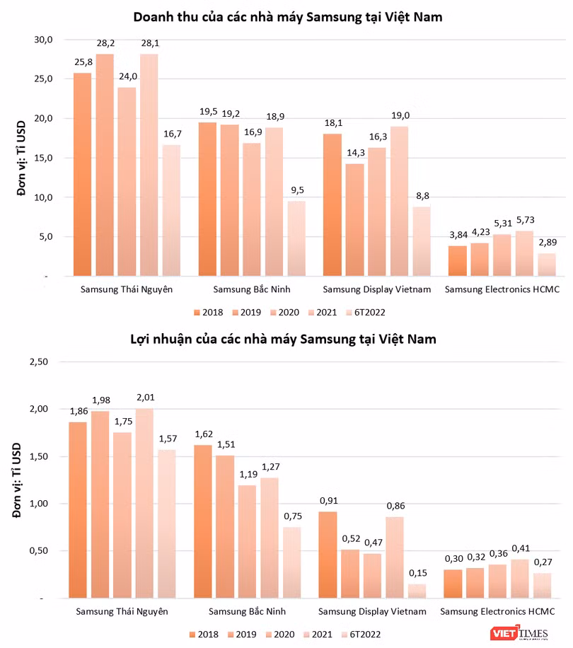 Trong nửa đầu năm 2022, bốn nhà máy lớn của Samsung Electronics tại Việt Nam ghi nhận tổng doanh thu đạt 46.662 tỉ won (khoảng 37,9 tỉ USD), chiếm 30% tổng doanh thu toàn tập đoàn. Lợi nhuận sau thuế của các nhà máy này là 3.377,9 tỉ won (khoảng 2,74 tỉ USD).