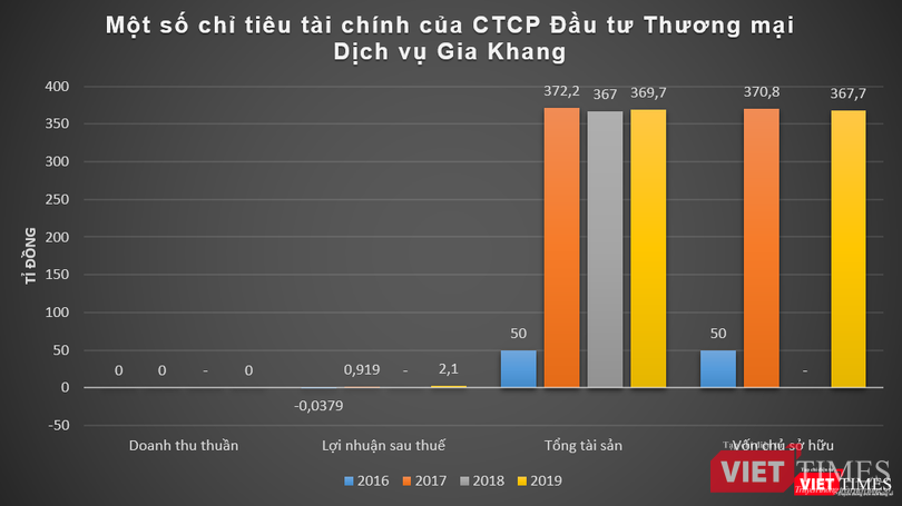 Dữ liệu của VietTimes cho thấy, trong giai đoạn 2016 - 2019, Gia Khang (công ty mẹ) không phát sinh doanh thu. Năng 2019, công ty này báo lãi sau thuế 2,1 tỉ đồng. Tại ngày 31/12/2019, quy mô tổng tài sản của Gia Khang đạt 369,7 tỉ đồng, vốn chủ sở hữu ở mức 367,7 tỉ đồng.