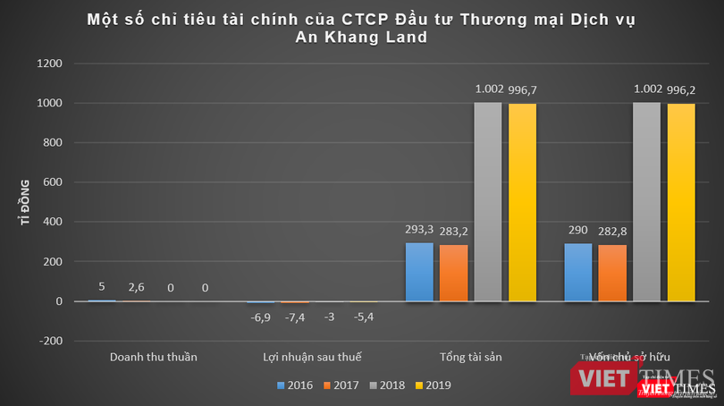 Dữ liệu của VietTimes cho thấy, trong giai đoạn 2016 - 2019, An Khang Land liên tục báo lỗ. Như năm 2016 và 2017, công ty này ghi nhận doanh thu thuần đạt lần lượt 5 tỉ đồng và 2,6 tỉ đồng, lỗ sau thuế tương ứng ở mức 6,9 tỉ đồng và 7,4 tỉ đồng.