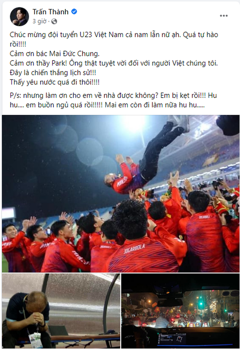 Bên cạnh lời chúc mừng U23 Việt Nam, Trấn Thành còn "cầu cứu" mọi người nhường đường cho về trước vì "buồn ngủ quá rồi".