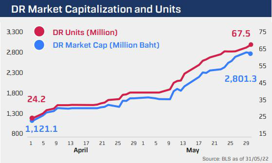 DR dựa trên DCVFM VNDiamond ETF (mã FUEVFVND) chỉ mới được IPO từ tháng 3/2022 nhưng đã gây sốt tại Thái Lan khi liên tục hút vốn mạnh. Tính đến cuối tháng 5, lượng DR FUEVFVND do Bualuang Securities phát hành đã lên tới 67,5 triệu đơn vị, tương ứng giá trị 2,8 tỷ Bath (khoảng hơn 1.900 tỷ đồng).