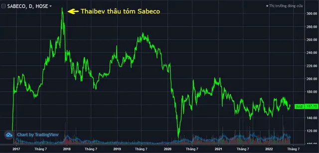 Sau thương vụ đình đám, SAB liên tục giảm sâu đặc biệt khi bị bị "kẹp" giữa 2 gọng kìm Covid-19 và Nghị định 100. Từ thị giá cao nhất sàn, cổ phiếu này có thời điểm đã rơi xuống dưới mức giá khi mới niêm yết và vẫn đang chật vật tìm về ánh hào quang xưa. Giá trị số cổ phần nắm giữ bởi Thaibev cũng theo đó "bốc hơi" một nửa còn khoảng 2,4 tỷ USD.