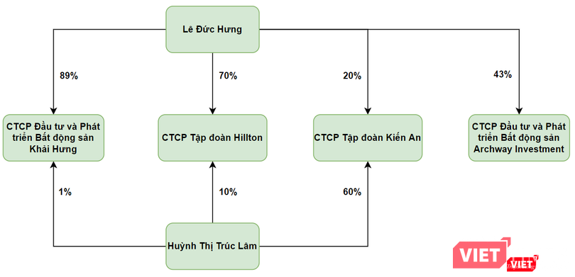 Ngoài Khải Hưng Corp, ông Lê Đức Hưng còn đang đứng tên tại một số pháp nhân khác như CTCP Đầu tư Xây dựng Hạ tầng Khải Hưng, CTCP Tư vấn thiết kế và Xây dựng Khải Hưng, hay cổ đông sáng lập góp 8,6 tỉ đồng, sở hữu 43% vốn điều lệ CTCP Đầu tư và Phát triển Bất động sản Archway Investment.