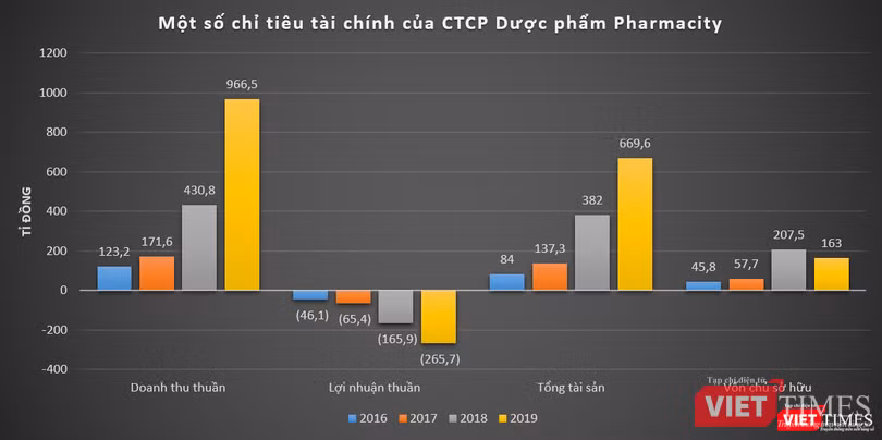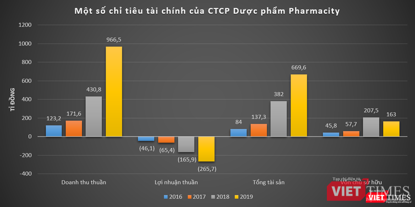 Dữ liệu của VietTimes cho thấy, trong giai đoạn 2016 - 2019, doanh thu của Pharmacity tăng gấp 7,8 lần, từ mức 123,2 tỉ đồng năm 2016 lên 966,5 tỉ đồng năm 2019.
