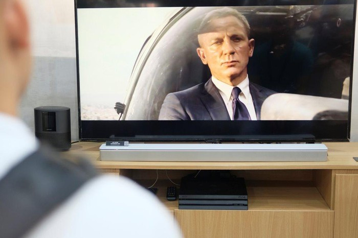 Đầu tiên, khu vực trưng bày lớn nhất với các sản phẩm thuộc hệ sinh thái âm thanh trong gia đình Bose Smart Home với hệ thống loa Soundbar 700 và Soundbar 500 với trải nghiệm gần như âm thanh rạp hát.