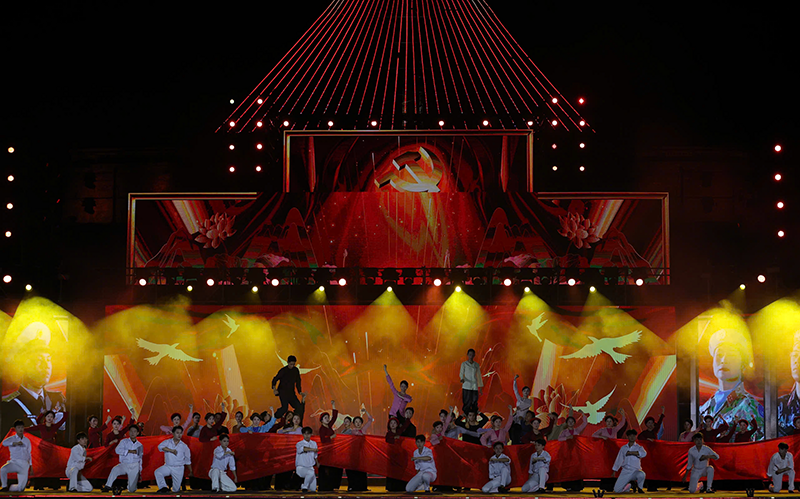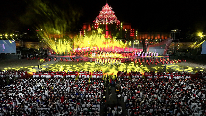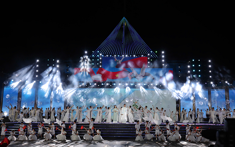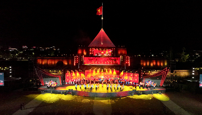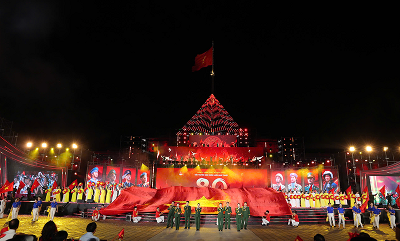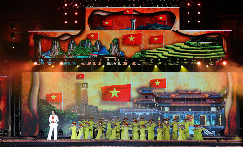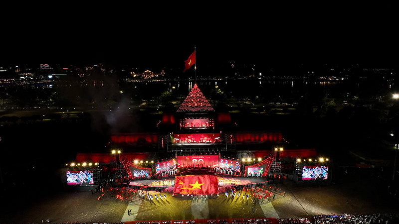Tối 9/8, chương trình nghệ thuật “Dưới cờ vinh quang” chào mừng kỷ niệm 80 năm Cách mạng tháng Tám và Quốc khánh 2/9 diễn ra tại 3 điểm cầu: Hà Nội – Huế – TP.HCM.
