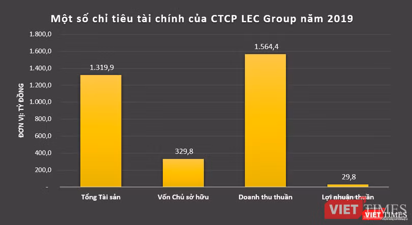 Dữ liệu của VietTimes cho thấy, năm 2019, LEC Group ghi nhận doanh thu thuần đạt 1.564,4 tỷ đồng, báo lãi thuần 29,8 tỷ đồng. Tính đến cuối năm ngoái, quy mô tổng tài sản của công ty này đạt mức 1.319,9 tỷ đồng, gấp 4 lần quy mô vốn chủ sở hữu.