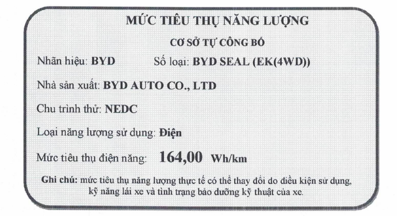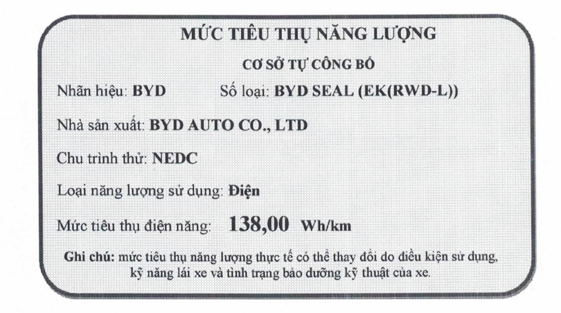 Bản công khai mức tiêu thụ điện năng của hai phiên bản BYD Seal tại Việt Nam.