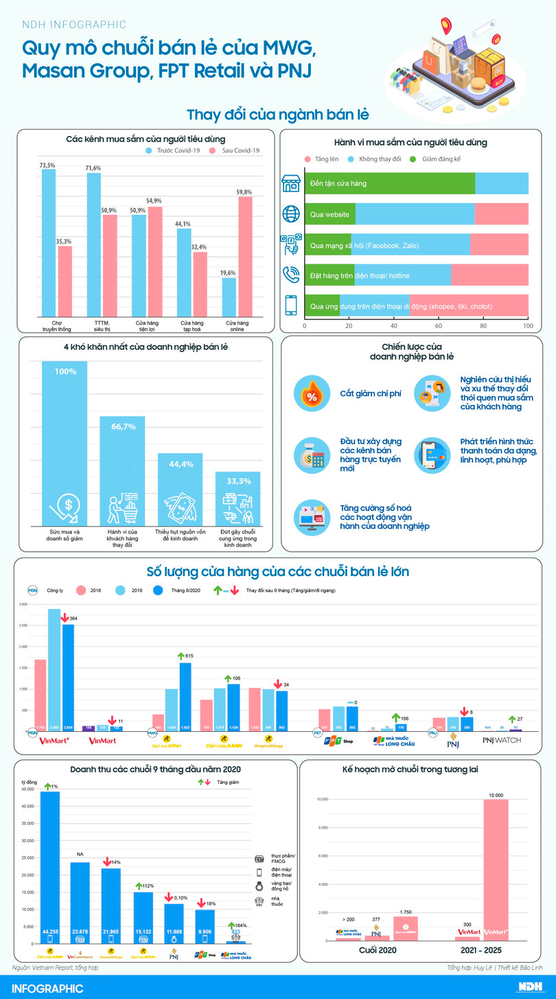 Ngành bán lẻ Việt Nam đã có những thay đổi lớn bởi đại dịch Covid-19, nhiều chuỗi kinh doanh đã phải đóng cửa nhưng cũng có nhiều đơn vị vẫn đang mở rộng hoạt động. Theo khảo sát của Vietnam Report, hoạt động mua sắm trực tiếp giảm trong đại dịch nhưng thương mại điện tử, mua sắm trực tuyến lại có tín hiệu tích cực.