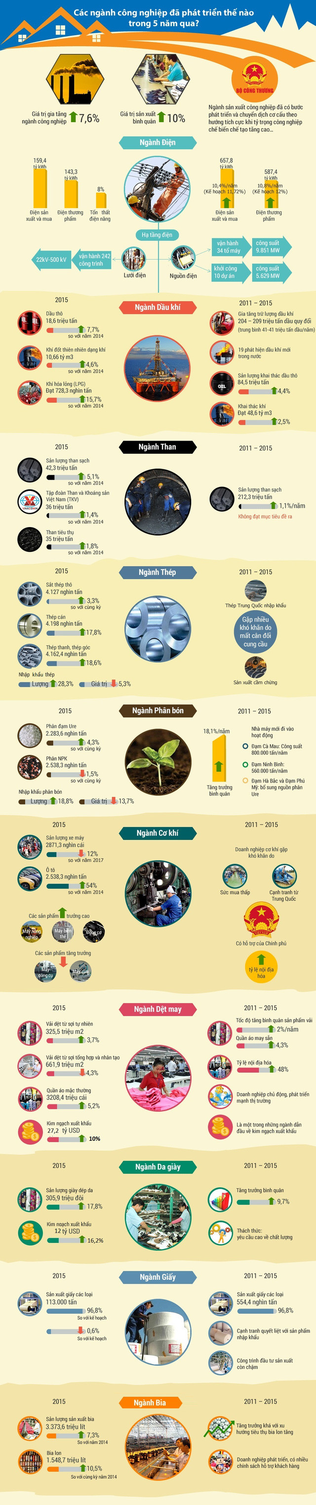 Sản xuất công nghiệp đã ngày càng có đóng góp quan trọng vào phát triển kinh tế của đất nước. Nhìn lại chặng đường 5 năm giai đoạn 2011 - 2015, nhiều ngành công nghiệp của Việt Nam đã đi lên và đạt được nhiều kết quả tích cực.