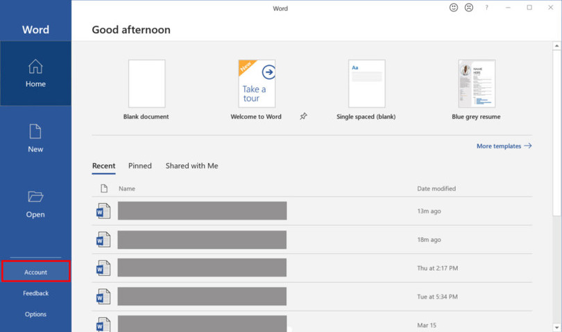 2. Chọn Account (Tài khoản) ở menu bên trái. Nếu bạn đang ở trong một tài liệu, nhấp vào File ở phía trên cùng rồi cuộn xuống mục Account ở trang tiếp theo.