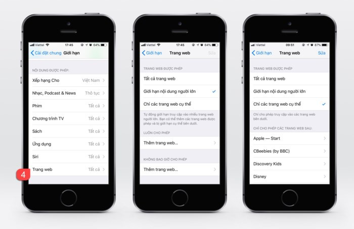 Sau khi đã bật hoặc mở khóa chức năng giới hạn, bạn cuộn xuống xuống dưới trên danh sách các cài đặt và chọn tùy chọn Websites (Trang web).