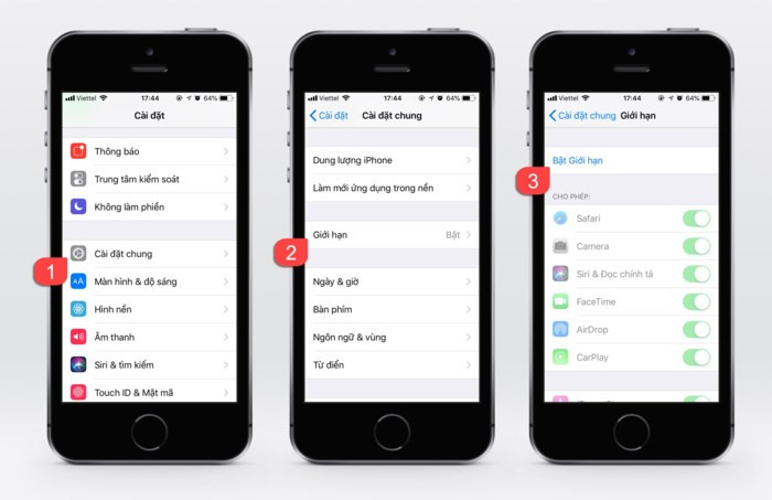 Để bắt đầu, trên iPhone hay iPad của con bạn, bạn truy cập vào Settings (Cài đặt) > General (Cài đặt chung) > Restrictions (Giới hạn). Nếu bạn đã bật giới hạn trên thiết bị này, bạn chỉ cần nhập mật khẩu giới hạn. Nếu chưa, bạn chỉ việc nhấn nút Enable Restrictions (Bật Giới hạn).
