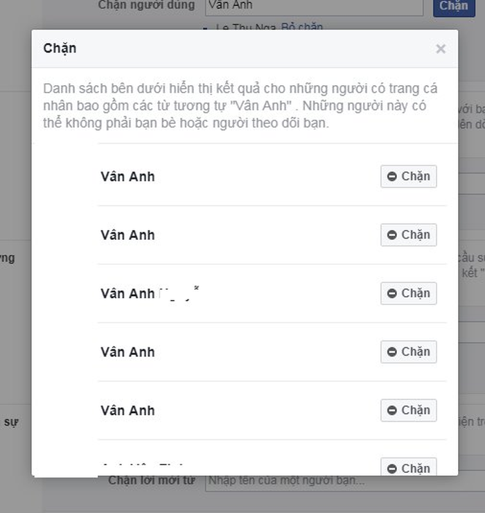 Bước 3: Nhập tên Facebook người đã chặn mình rồi nhấn Chặn. Danh sách các tài khoản trùng tên hiện ra, bạn chỉ cần nhấn Chặn ở Facebook mình muốn. Ngay cả khi họ đã chặn bạn, tên Facebook của họ vẫn hiện ra trong danh sách.