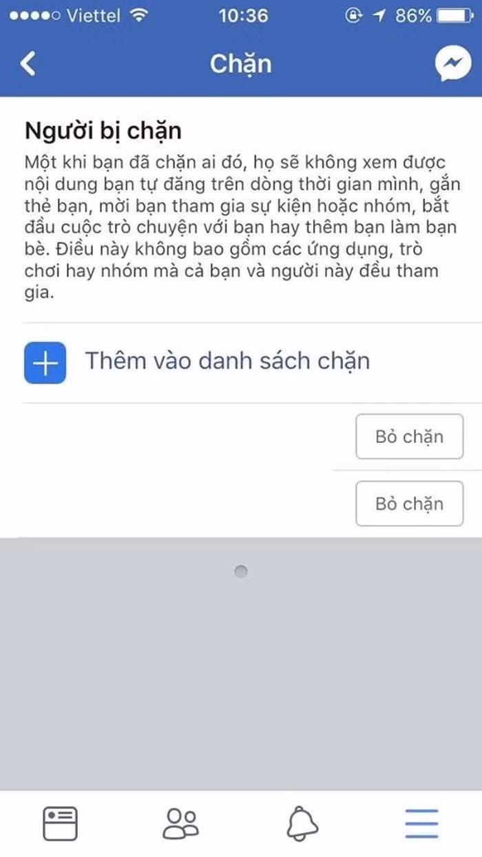 Bước 3: Danh sách người bị bạn chặn xuất hiện ở đây. Bấm vào Thêm vào danh sách chặn.