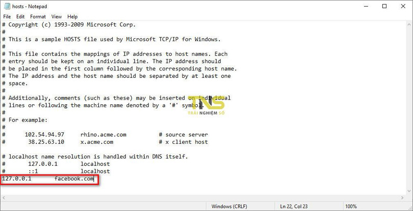 Bước 4: Mở file hosts lên bằng Notepad, khi muốn chặn web nào bạn chỉ cần thêm vào dòng 127.0.0.1 <tên trang web> như ảnh dưới.