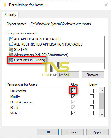 Bước 3: Ở trên bạn chọn Users…, phía dưới bạn đánh dấu tick vào ô Full Control, sau đó OK để xác nhận. Bước 2 và bước 3 để cấp quyền bạn sửa nội dung file hosts.