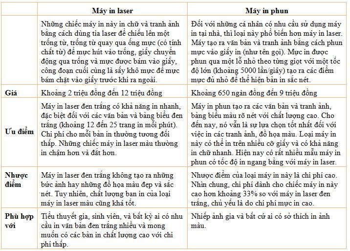 Mỗi loại – máy in phun hoặc máy in laser – đều có những ưu và nhược điểm riêng. Mời bạn tham khảo bảng so sánh sau để có quyết định cho riêng mình.