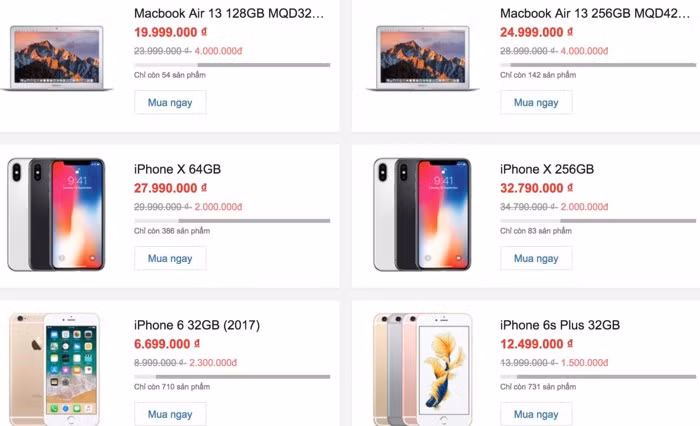 Bên cạnh đó, bộ đôi iPhone 8 và 8 Plus màu đỏ 64 GB vừa về Việt Nam cũng được giảm giá 2 triệu đồng, đẩy mức giá hiện tại xuống lần lượt còn 18,99 triệu và 21,99 triệu đồng. Tương tự, phiên bản iPhone 8 và 8 Plus màu đỏ 256 GB còn 23,79 triệu và 26,79 triệu đồng. Ngoài ra, những thiết bị chính hãng đời cũ như iPhone 6 32 GB (2017) cũng chỉ còn 6,69 triệu (giảm 2,3 triệu đồng), iPhone 6S Plus 32 GB còn 12,49 triệu đồng (giảm 1,5 triệu đồng).