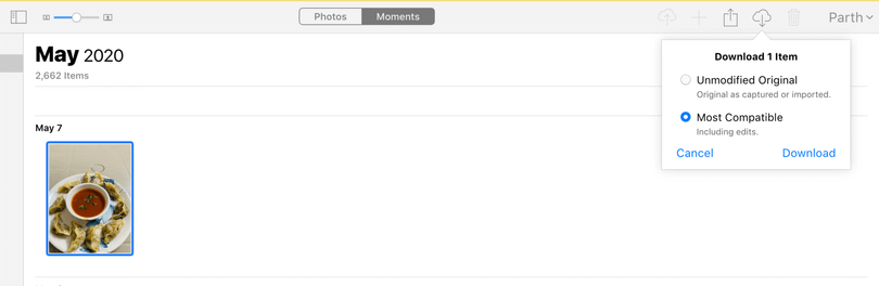 Bước 5: Bây giờ, bạn bấm lên nút mũi tên hướng xuống bên cạnh biểu tượng hình đám mây có nút mũi tên cũng hướng xuống ở phía trên góc phải, sau đó chọn Most compatible (Tương thích nhất). Bấm nút Download (Tải về) và iCloud sẽ tải về ảnh bạn đã chọn dưới định dạng JPEG.