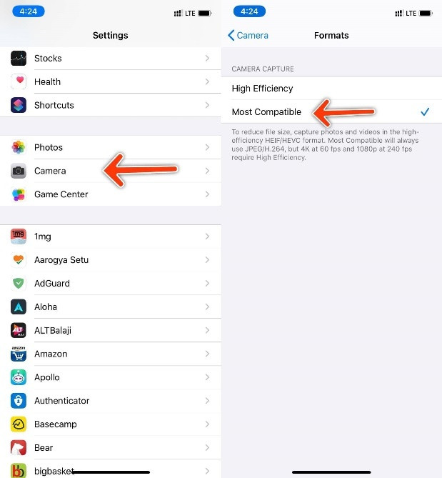 Bước 4: Tại đây, bạn sẽ thấy hai tùy chọn trong phần Camera Capture (Chụp bằng camera) bao gồm: High Efficiency (Hiệu suất cao) và Most Compatible (Tương thích nhất). Tùy chọn đầu tiên sẽ chụp ra ảnh có định dạng HEIC, trong khi tùy chọn Most Compatible sẽ chụp ra ảnh có định dạng JPEG. Do vậy, bạn hãy chọn tùy chọn Most Compatible.