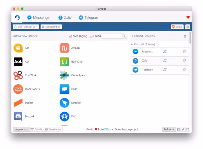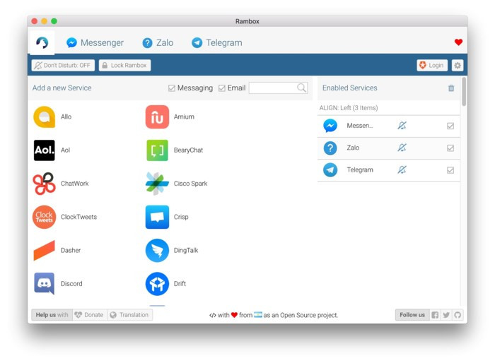 Nếu cảm thấy All-in-One Messenger quá ít dịch vụ, bạn hãy thử phần mềm Rambox tại địa chỉ http://bit.ly/rambox-1, tương thích Windows, macOS và Linux. Đối với phiên bản miễn phí, bạn chỉ có thể quản lý được khoảng 99 ứng dụng và dịch vụ OTT khác nhau, tuy nhiên, nhiêu đó là đã quá đủ đối với một người dùng thông thường.
