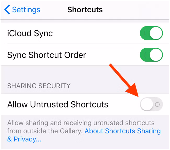 Lưu ý: Nếu bạn thấy tùy chọn Untrusted Shortcuts (Phím tắt chưa được tin cậy) bị mờ đi, bạn chỉ cần quay lại ứng dụng Shortcuts (Phím tắt), sau đó chạy một phím tắt bất kỳ trong bộ sưu tập. Hoàn tất, bạn quay lại phần Settings (Cài đặt) > Shortcuts (Phím tắt) và bạn sẽ thấy tùy chọn Untrusted Shortcuts (Phím tắt chưa được tin cây) đã sáng lên.