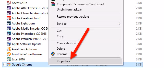 Nếu chọn từ Start Menu trên Windows 10, nhấn chuột phải vào biểu tượng Google Chrome -> More -> Open file location -> nhấn chuột phải vào Google Chrome trong cửa sổ Programs mới hiện ra -> Properties.