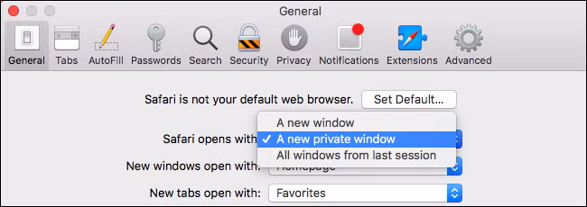 Giọng với Firefox, Safari trên macOS cũng có sẵn tùy chọn cho phép luôn khởi động ở chế độ ẩn danh.