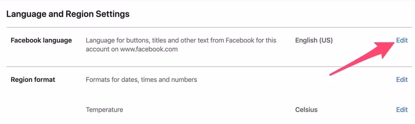 Bước 4: Bấm nút Edit nằm bên phải mục Facebook language, sau đó chọn ngôn ngữ bạn muốn đổi sang, chẳng hạn tiếng Việt.