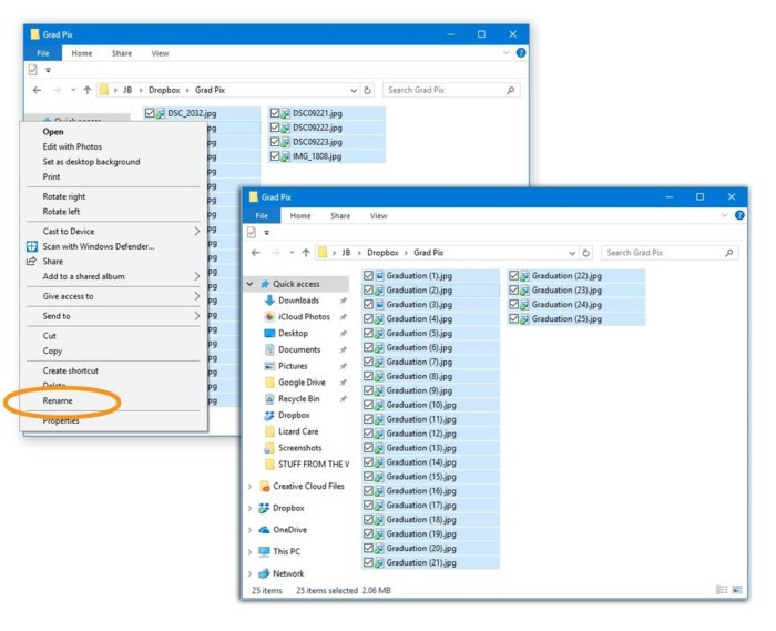 Để đổi tên nhiều file cùng một lúc trên Windows, bạn cần mở folder đó ra, chọn tất cả ảnh bên trong. Bấm chuột phải vào nhóm này, chọn Rename từ menu và nhập từ khóa cho một trong các file. Bấm Enter để đổi tên tất cả các file này kèm theo số thứ tự ở tên file.