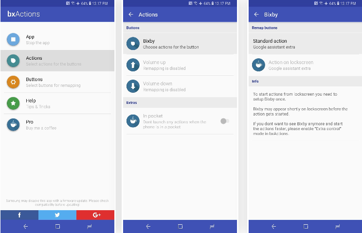 Để bắt đầu, người dùng cần chắc chắn phím Bixby đã được kích hoạt vì bxActions sẽ không hoạt động nếu tính năng này đã bị vô hiệu hóa. Thời lượng sử dụng pin có thể sẽ bị ảnh hưởng đôi chút bởi bxActions luôn chạy dưới dạng một ứng dụng nền.