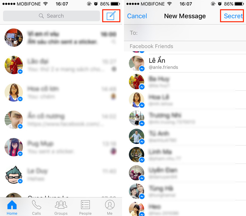 Đầu tiên, bạn cần mở ứng dụng Facebook Messenger và nhấn nút Compose New Message ở phía trên góc phải, chọn Secret ở trên cùng bên phải.